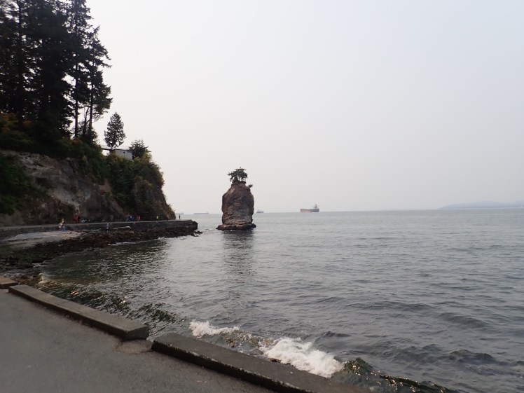 Vi cyklade förbi ett gäng herrar som spelade cricket, några kända totempålar och skulpturen "Girl in A Wet suit" som ser ut som Lille havefruen men som har cyklop och simfötter istället för fiskstjärt. Sällskapet tyckte att det var för skönt att rulla på för att stanna för några fotomoments men vi fick i alla fall en bild på den 18m höga klippan Siwash Rock i farten!