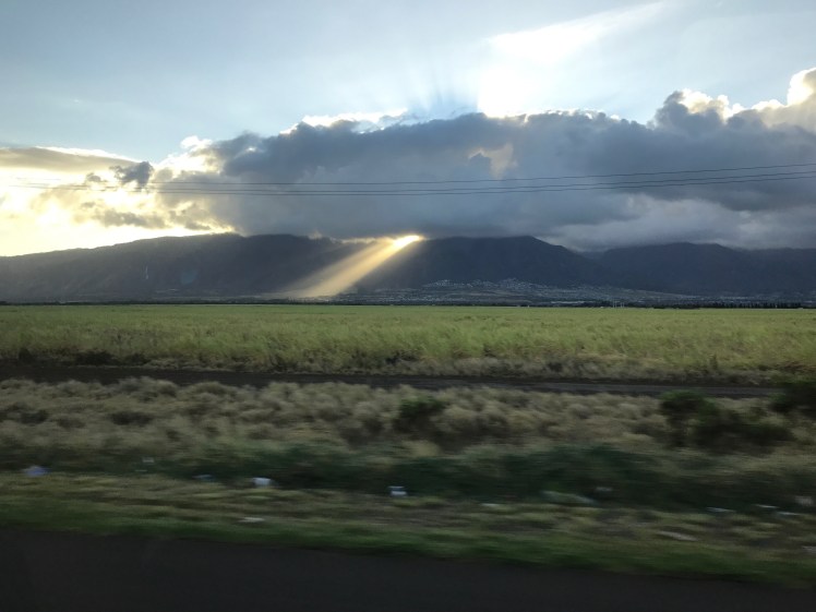 Det är som sagt inte svårt att hitta vackra och dramatiska vyer på denna ö. Nöjda och glada fick vi ett sista fototillfälle på den västra vulkanen Pu’u Kukui när solen strålar genom molnen. En värdig avslutning på dagen!