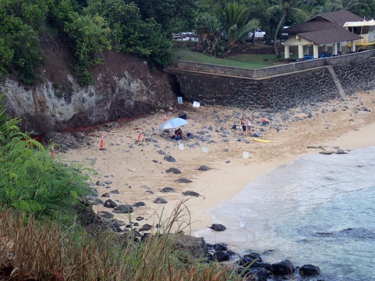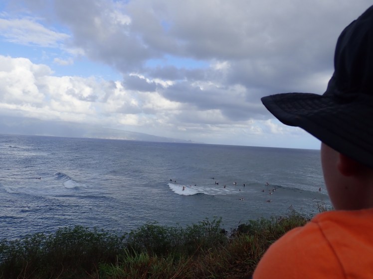 Frukost bestående av muffins och ananasskivor avnöjts intill Ho’okipa beach där surfarna och sköldpaddorna samtidigt hade samlats.
