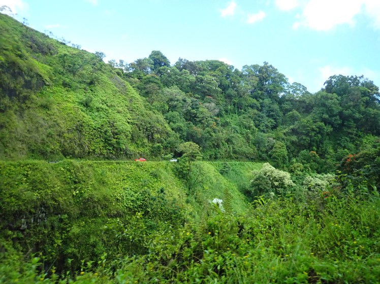 Färden forstatte sedan genom allt tätare skog. Lite kuriosa är att en del scener till Jurrasic Park har spelats in på Maui, och det känns verkligen som om dinosaurier fortfarande skulle trivas här. En övervägande del av Mauis flora består av arter som emmigranter tagit med sig. De första bosättarna kom från Polynesien för cirka 1500 år sedan och tog med sig olika födoväxter och djur. Och så har det fortsatt, till exempel växer bambu som gräs (!) här och bildar långa korridorer över vägen.