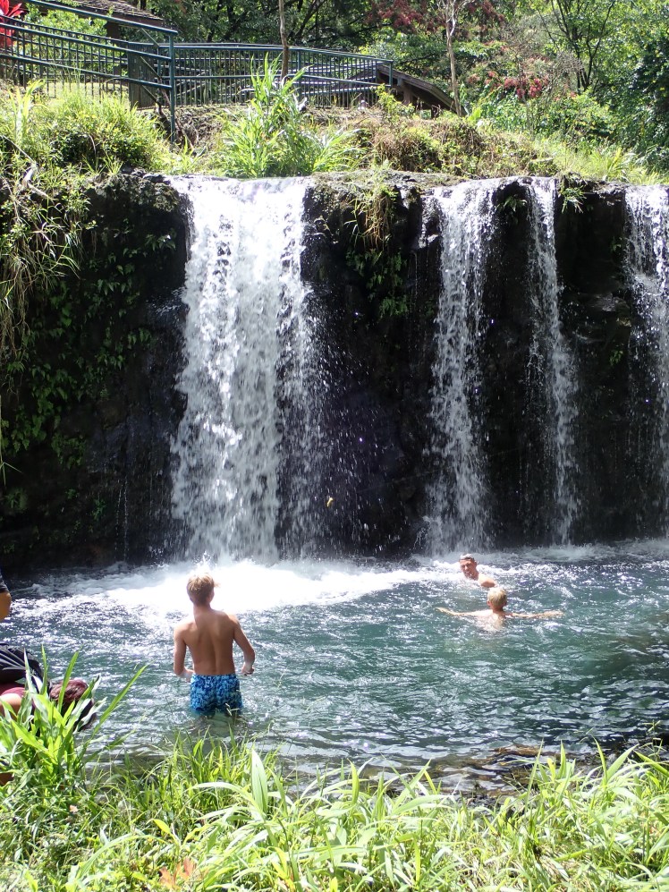 Djupa dalar med höga vattenfall skär igenom skogen och bildar tillsammans ett otroligt scenario. Plötsligt stannar vi vid ett vattenfall där bad erbjuds, något som hela familjen tar fasta på och hoppar i. En ganska cool upplevelse.