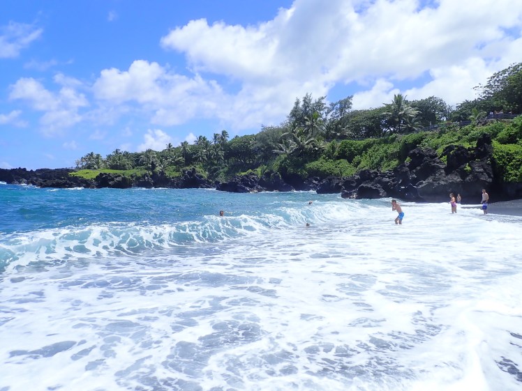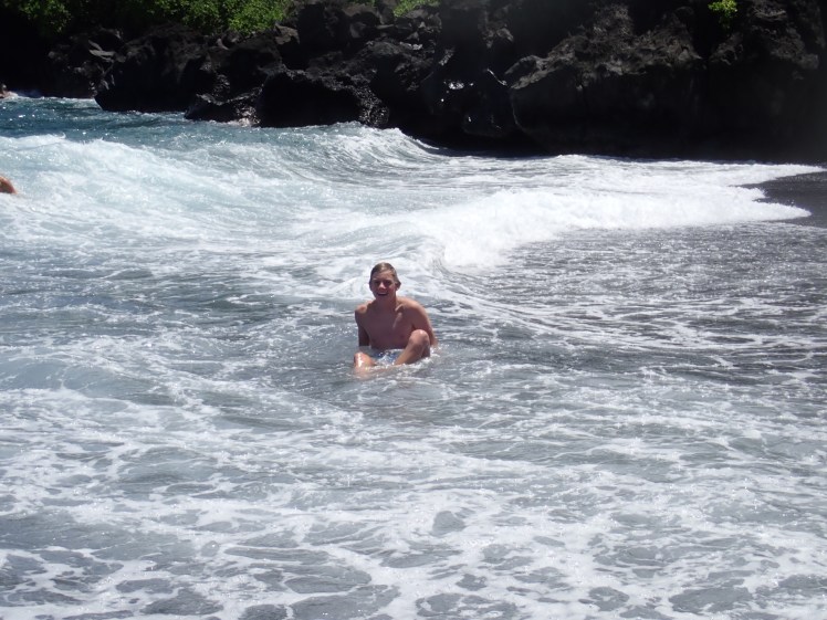 Väl tillbaka i bussen blev näst stopp Black sand beach där vågorna gick höga. Även här gick det att få sig ett dopp, dock fick man kämpa mot vågorna för att komma ut en bit, men det var desto lättare att komma upp på stranden igen.