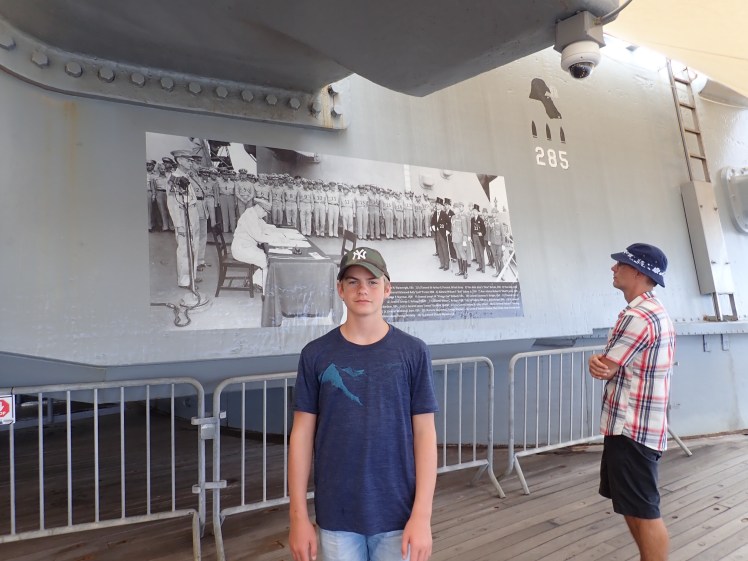 Efter en fin korvlunch satte vi kurs mot sista målet, slagskeppet USS Missouri som under sina nära 50 år i tjänst nu är ett museiskepp. Fartyget var med i såväl andra världskriget, koreakriget och efter att ha upprustats på 80-talet även i Kuwaitkriget. Mest känt är dock att det var på detta fartyget som Japan undertecknade fredsfördraget med de allierade den 2 september 1945, slutet på kriget!