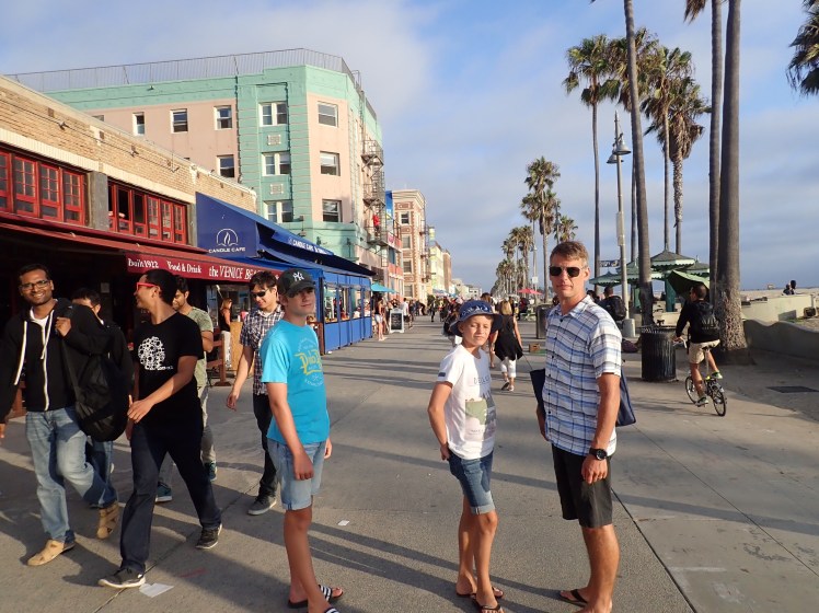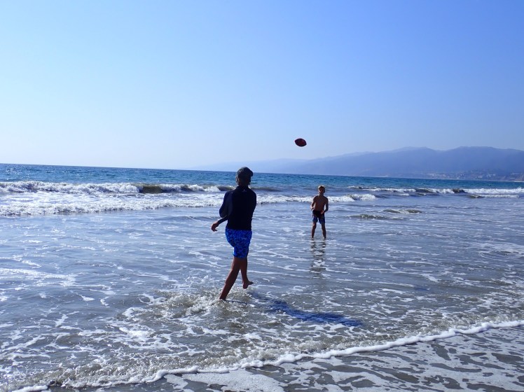 Väl i Santa Monica gick vi en sväng på den väldigt trevliga gågatan 3rd Street Promenade innan vi styrde stegen mot stranden. Santa Monica Beach var verkligen enorm, hälften öken, hälften strand. Otto och Karl har nog blivit lite bortskämda då det klagades på såväl vattenkvalitet, sjögräs som snäckor på botten. Men visst blev det bad och lite amerikansk fotboll på stranden.