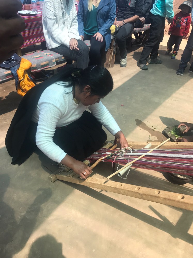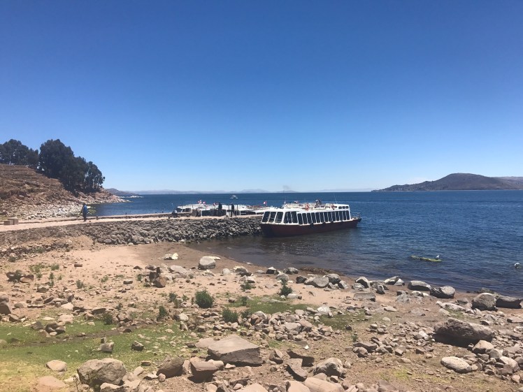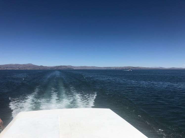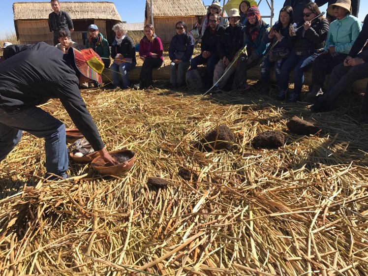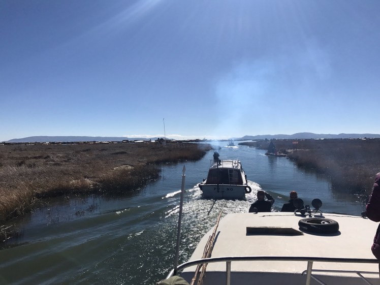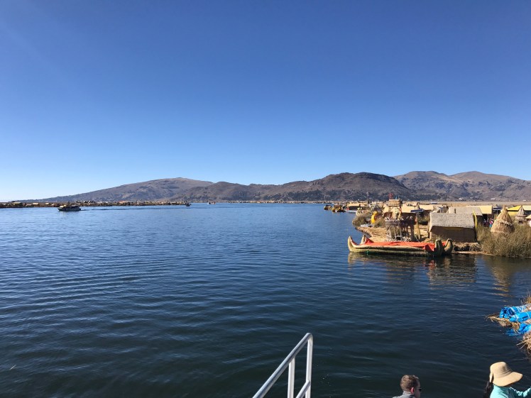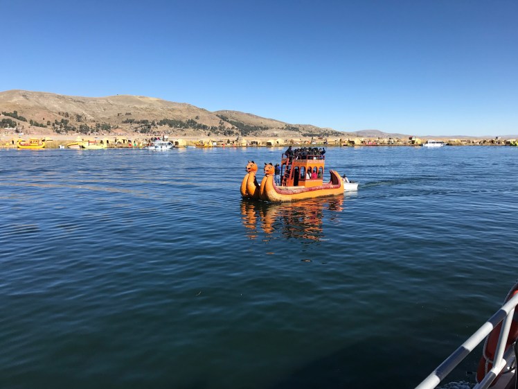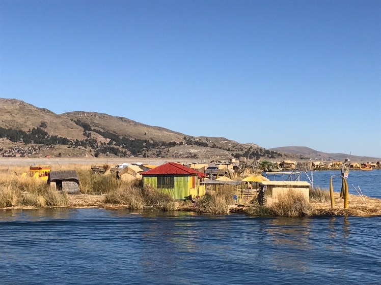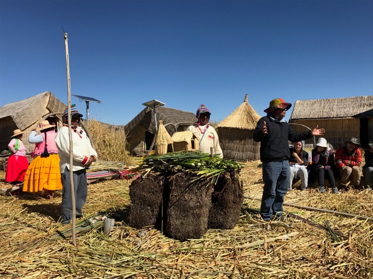 Vi stannade till vid den flytande staden Uros som är en helt overklig plats. Staden består av ca 90 ”öar” som befolkningen själv tillverkar av flytande torv och vass. Den ö vi besökte bestod av 20 st block á 5×10 meter och där huserade fem familjer, totalt 20 personer. Människorna flyttade ut på dessa öar före kolonisationen, antagligen beroende på brist på mark. Man har sedan dess flutit runt på sjön men efter en svår storm på 1970-talet är nu staden ”bofast” utanför staden Puno.
