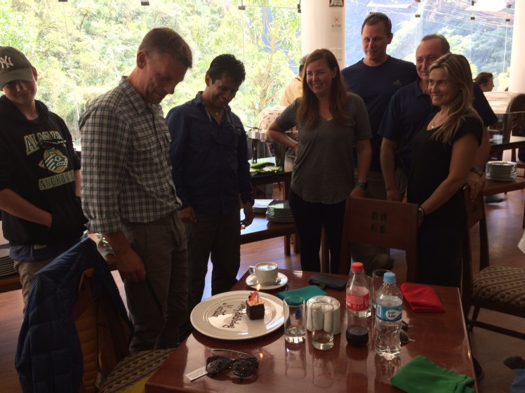 Efter besöket på Machu Picchu åt vi en sista lunch tillsammans med gruppen. Som grädde på moset blev Martin firad med tårta! Vi åkte sedan tåg tillbaka till Cuzco där det återigen blev ett parti Monopol.