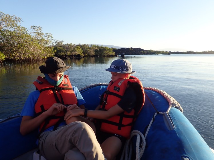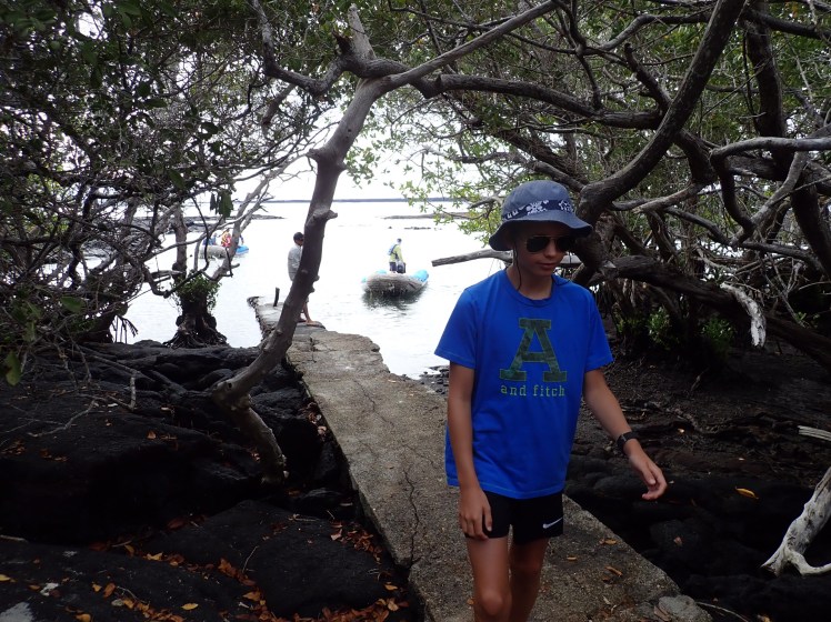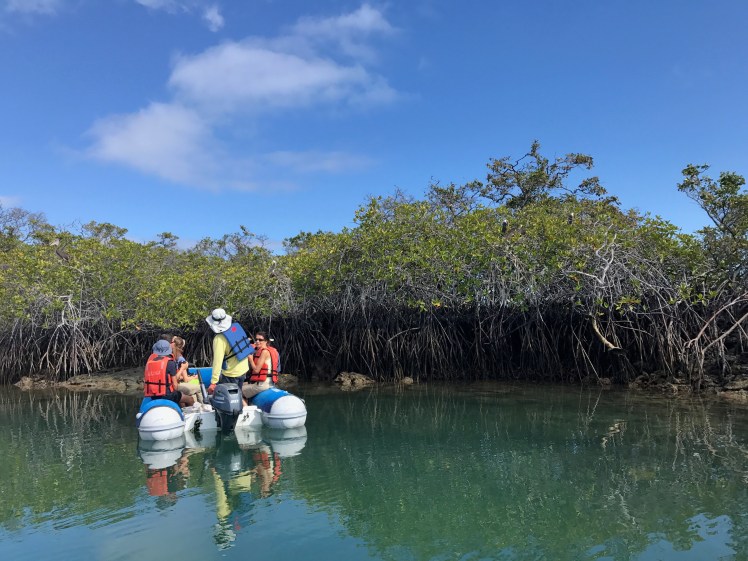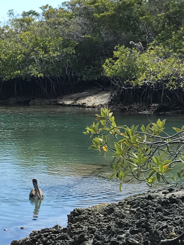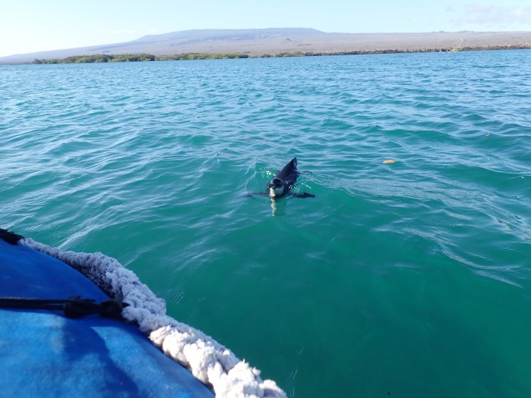Mangrovern som växer här i Elisabeth Bay var verkligen riklig och det kändes ibland som att åka runt i en skärgård. Speciellt är dock att botten består av sylvass lava och att alla stenar inte är stenar. Det gäller att konstant hålla utkik efter sköldpaddor som sticker upp sina huvuden över ytan eller simmar en bit under ytan. Spända över att få se Galapagospinginver spejade vi ut över vattnet. Till slut lyckas vi se den första pingvinen väl kamouflerad på en klippa. Efter att ha blivit avslöjad gav den en uppvisning i såväl tvagning som simning och jakt tillsammans med ett gäng pelikaner.