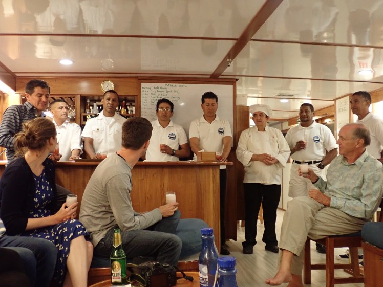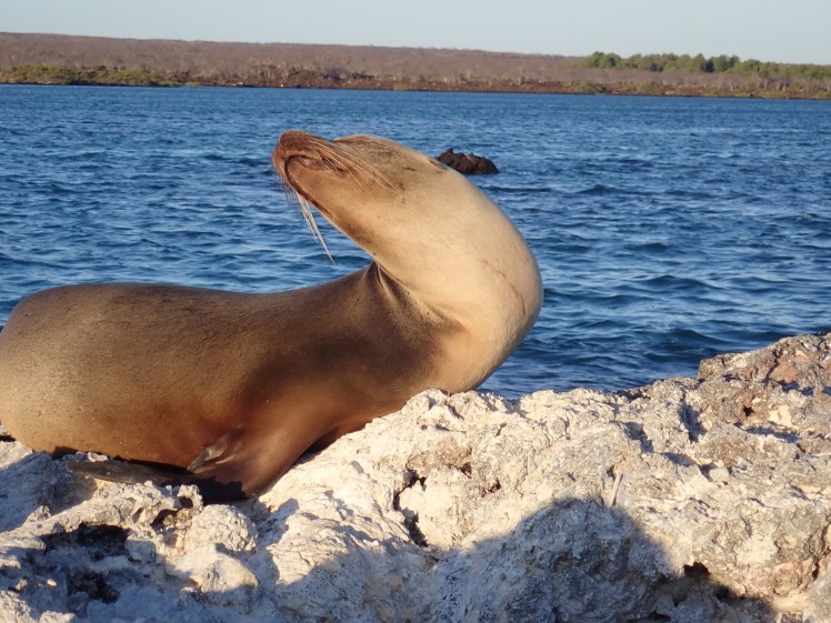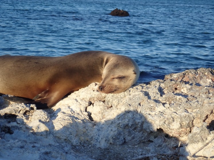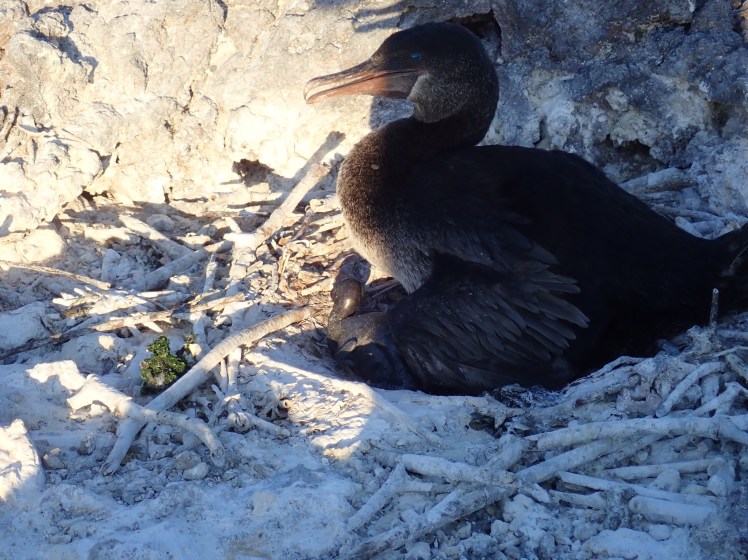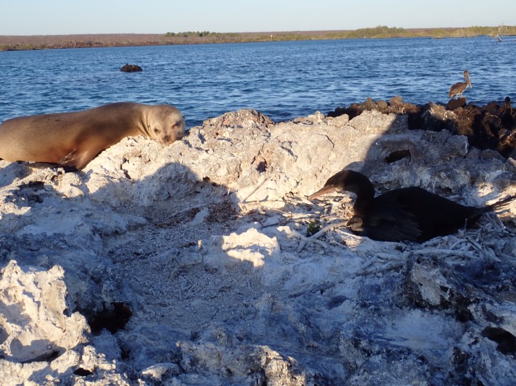 Sjölejonen följer oss i stort sett över allt och ger oss många glada upplevelser och skratt. På spanska kallas de sjöhundar och den liknelsen känns väldigt träffande. På vägen tillbaka till Beluga blev vi ledsagade av ett gäng pingviner och vi såg ett sjölejon som låg och njöt i solen. Precis bredvid låg sedan en Galapagosskarv och matade sin unge. Skarven upptäckte att den inte behövde kunna flyga för att skaffa föda på Galapagos, så här kan den faktiskt inte längre flyga och vingarna har med tiden blivit mindre och mindre.