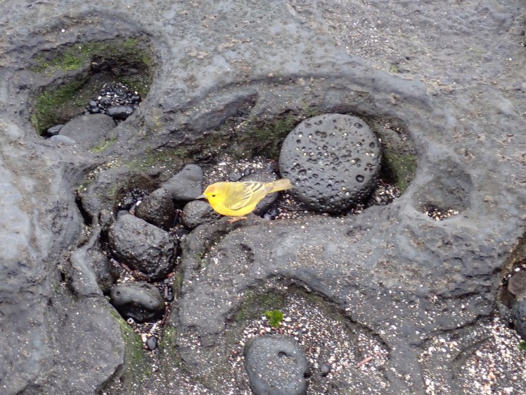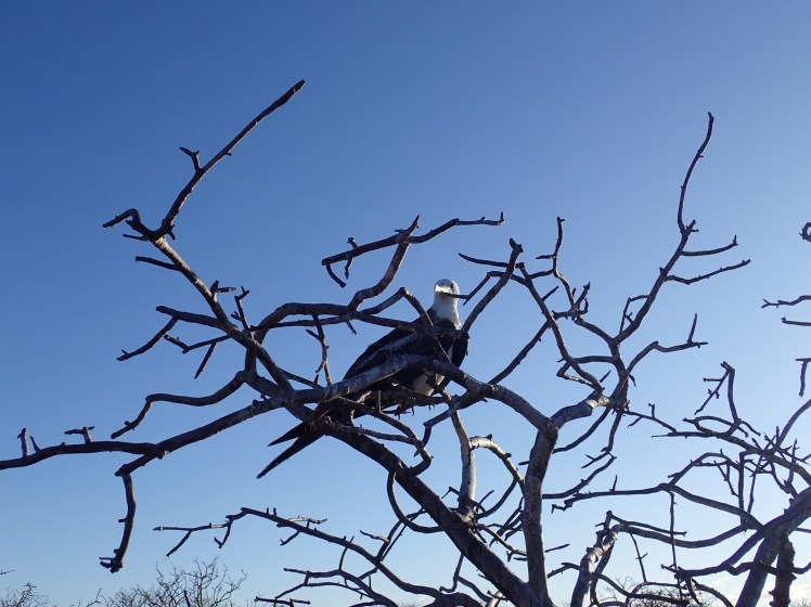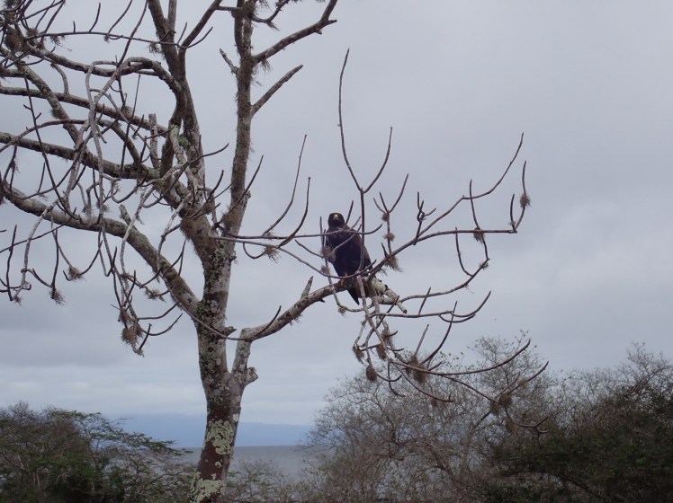 En galapagoshök spejade i ett träd och en och annan fågel skuttade omkring.