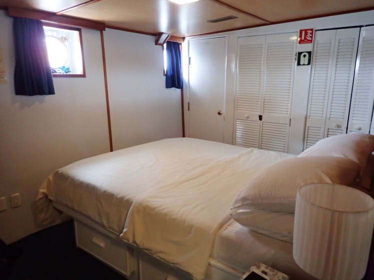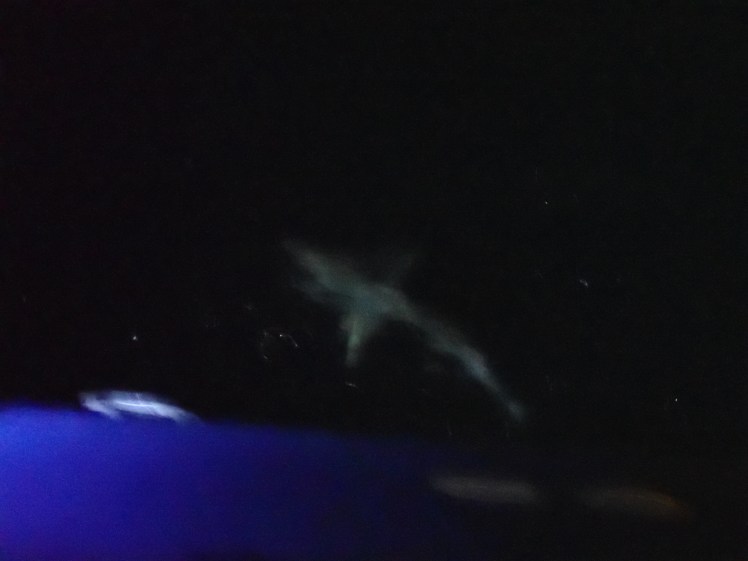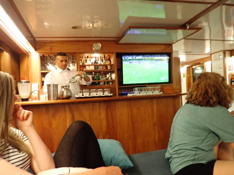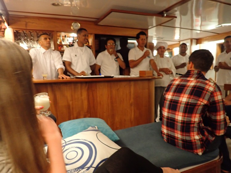 Under eftermiddagsvilan vågade 😉 vi oss ytterligare en bit till North Seymour Island för att glasen skulle kunna stå stadigt på borden igen när det var dags för vår avslutningsmiddag på båten. Vid fördrinken såg vi Ecuador förlora en fotbollsmatch mot Argentina och tackade sedan besättningen för vår fantastiska resa. Innan det var dags att för sista gången krypa i säng i våra mysiga hytter gick vi på spök/haj-jakt med ficklampor och såg flera vålnader cirkulera runt båten.