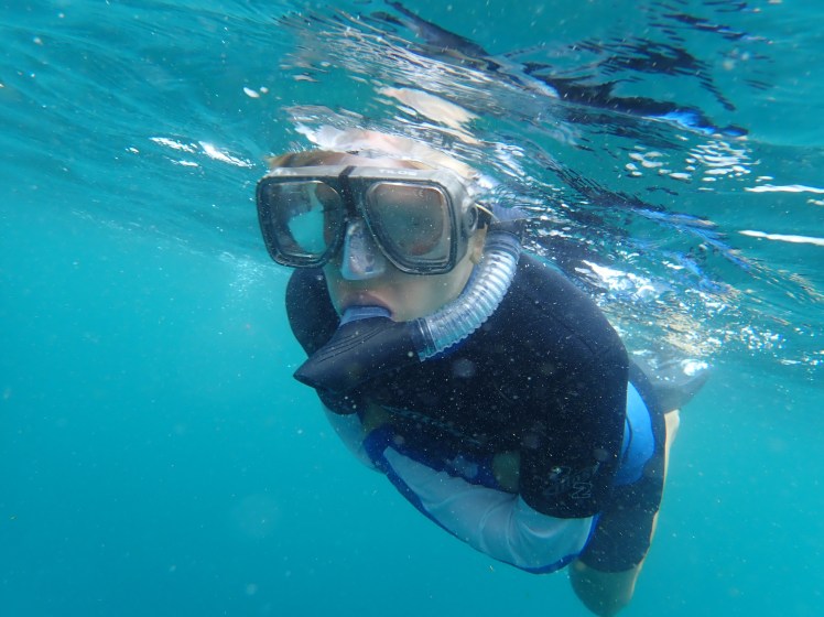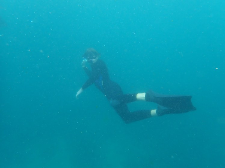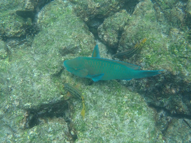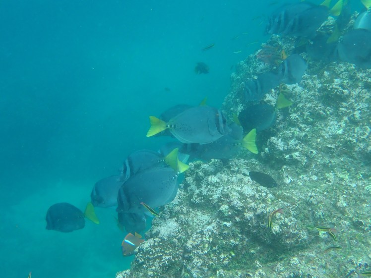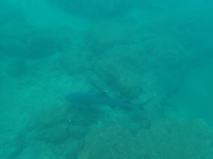 Trots det ruggiga vädret var det skönt i havet och vi hoppade glatt i det klara vattnet för ännu en snorkeltur innan lunch. Vi simmade med vitfenad haj, sjölejon, sköldpaddor och en massa exotiska fiskar.