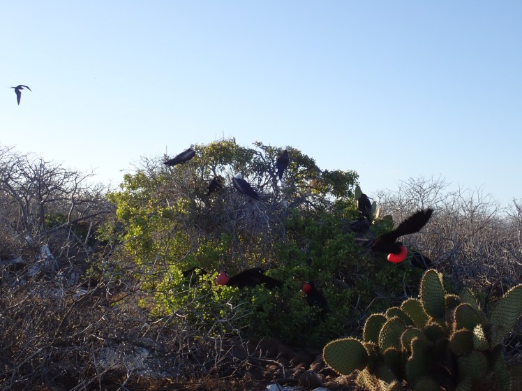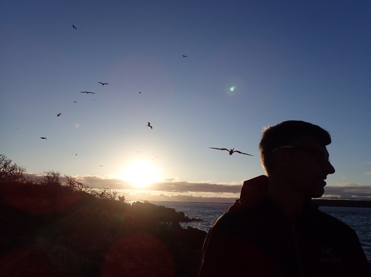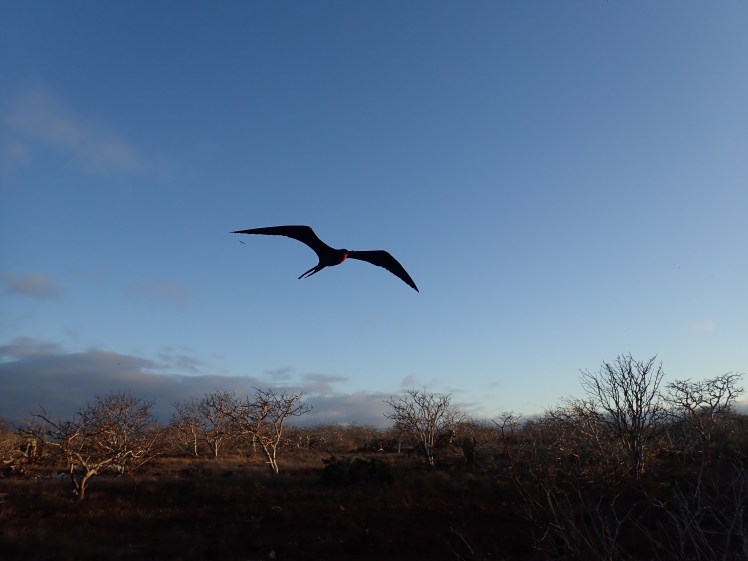 För de fågelintresserade hemvändarnas skull hoppade vi i land på North Seymour redan klockan sex denna morgon. Inte ens en liten intressevimpel var hissad i vår familj så mer sanningsenligt var det bara halva skaran som pliktskyldigt följde med. Men trots vår okunnighet var det en fin upplevelse att andas den friska morgonluften och se fåglarna flyga och jaga mat i soluppgången. En del av fåglarna fiskade idogt och andra arter som inte hade den förmågan fick försöka stjäla av fångsten istället.