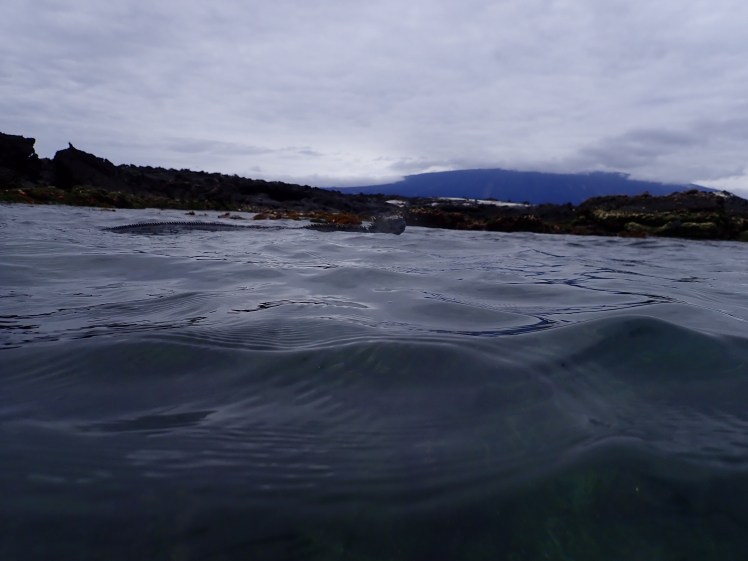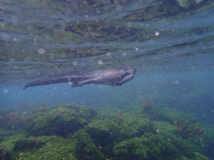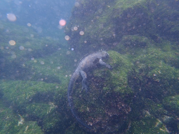 Tillbaka på Beluga bytte vi snabbt för snorkling, vi skulle nu ner under ytan för att simma med ödlorna, hu! Väl under ytan möttes vi än en gång av en mängd färgglada fiskar och av sköldpaddor som majestätiskt glider förbi, helt oberörda av vår närvaro. Helt plötsligt sitter det så en ödla och lugnt äter alger på en sten under ytan. När vi närmade oss simmade den lugnt iväg och vi fick fina bilder både under och över ytan.
