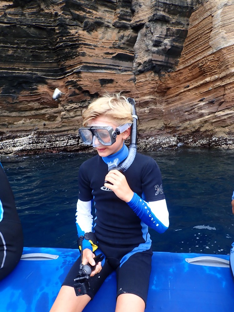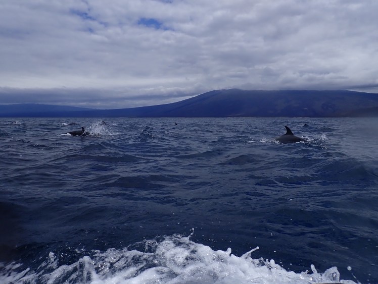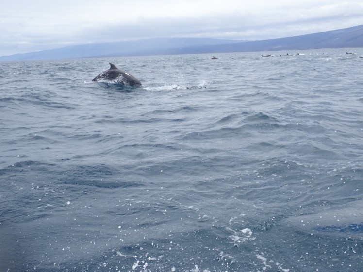 Så helt plötsligt börjar vår guide hoppa och vifta med armarna och skrika. Det tog en stund innan vi förstod vad han skrek men tillslut uppfattade vi – delfiner! Snabbt som ögat simmade vi till gummibåtarna och drog iväg bort mot Isabela där vi efter en stund kunde se ryggfenor som klöv ytan. Ett stort stim med delfiner. Vi kommer närmare och närmare och som tur var lyckades vår båtförare Angel genskjuta stimmet så att vi helt plötsligt hamnar mitt ibland nyfikna delfiner som simmar tätt runt båten. Vi kunde även se några tumlare.