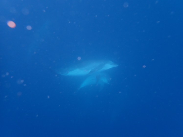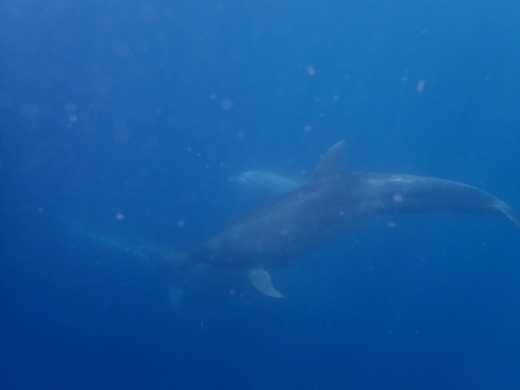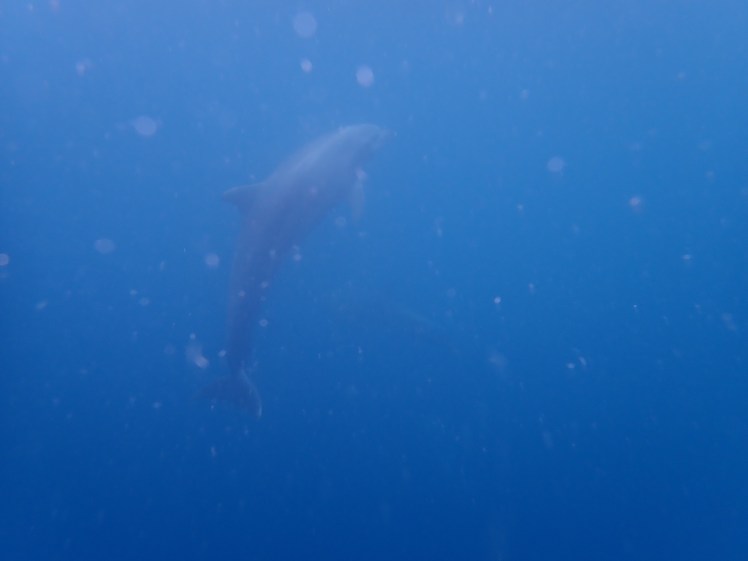 Vi filmar för fullt när Angel plötsligt pekar på havsytan och skriker IN, IN! Snabbt på med masker och snorklar och sedan var det bara att vräkas sig överbord i farten. Otto höll filmkameran i gång så vi fick en kanonfilm på delfiner ovan och underifrån. Väl nere i vattnet fick vi den mest fantastiska upplevelsen. Delfiner som simmar runt oss i full fart och sedan ljudet. Vi hör såväl de höga ljud som knattrandet delfiner använder för navigering och kommunikation. Vår leenden sträckte sig flera gånger runt huvudena när vi simmade tillbaka mot båten.