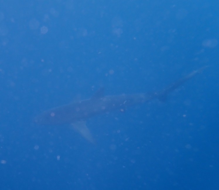 Då Martin kommer sist simmande mot båten dyker det upp ytterligare en nyfiken besökare. En Galapagoshaj på ca 2-3 meter simmar lojt under båten och bestämmer sig till slut att vi inte är ätbara. Puh!