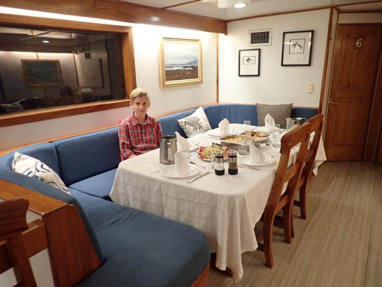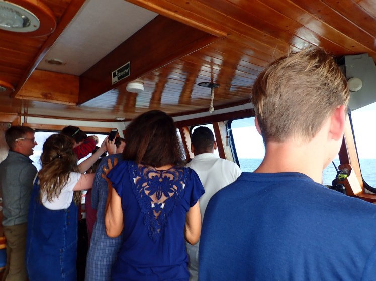 Väl tillbaka ombord på Berluga får vi återigen lite varm choklad och snacks innan båten lättar ankar för färd mot nordspetsen på Isabel. Vi njöt av färden uppe på soldäck en stund tills det att skeppsklockan ringer och vi samlas i styrhytten för drink och – passering av ekvatorn. Lika spänt som väntan på tolvslaget ser vi när GPSen räknar ner och till slut landar vi på ekvatorn, latitud 0. Ett festligt ögonblick som förevigas sedan bär det av igen.
