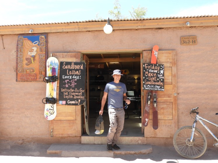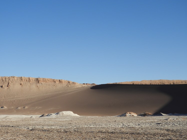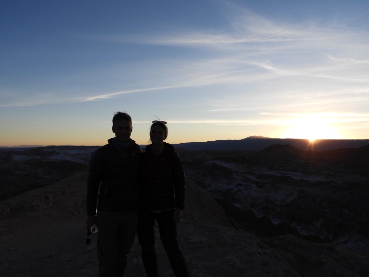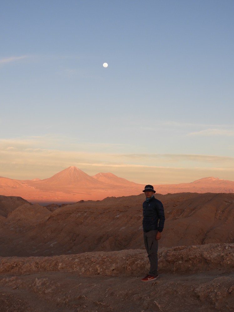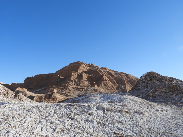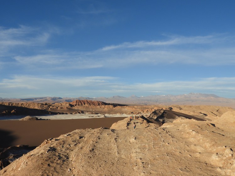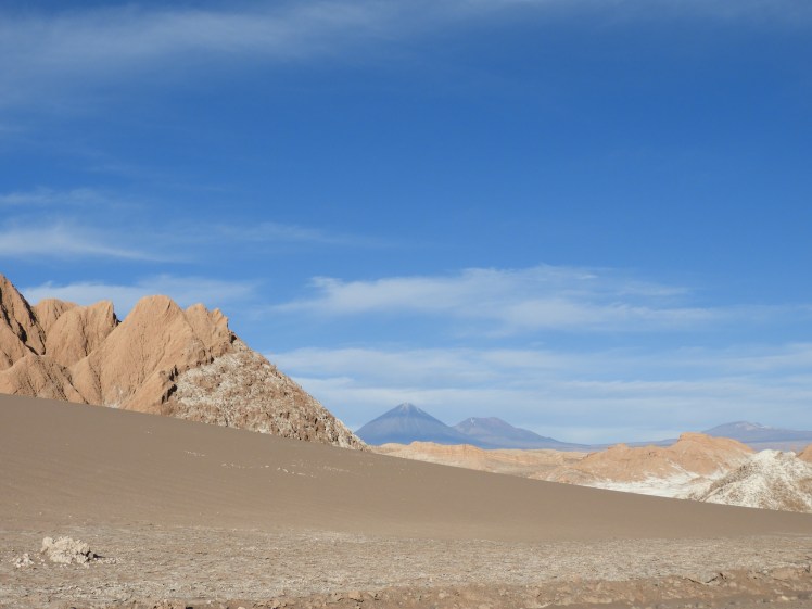 Regionen har 320 molnfria dagar per år men den eftermiddagen vi valde att göra vår tur till Valley of the moon var inte en av dem. Det var dock bara några lätta skyar som syntes på himlen och vi kunde vid första stoppet se ända till vulkanen Laskar och ett annat berg som var hela 35 mil bort. Vi såg också den internationella radioteleskopstationen Alma och den heliga vulkanen Licancabor som ofta avbildas på murar t ex som på vårt hostel. San Pedro syntes som en grön oas i allt det rödbruna och är det eftersom den försörjs av vatten från två floder som har sitt ursprung i bergen.