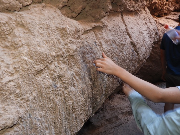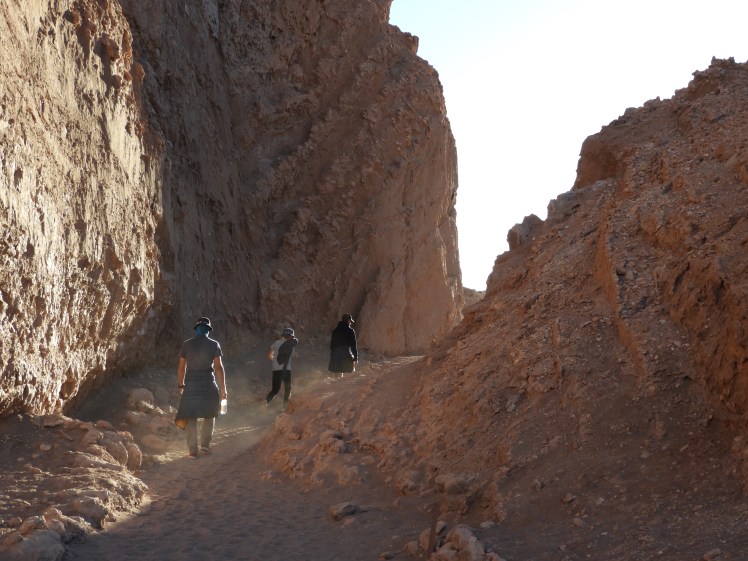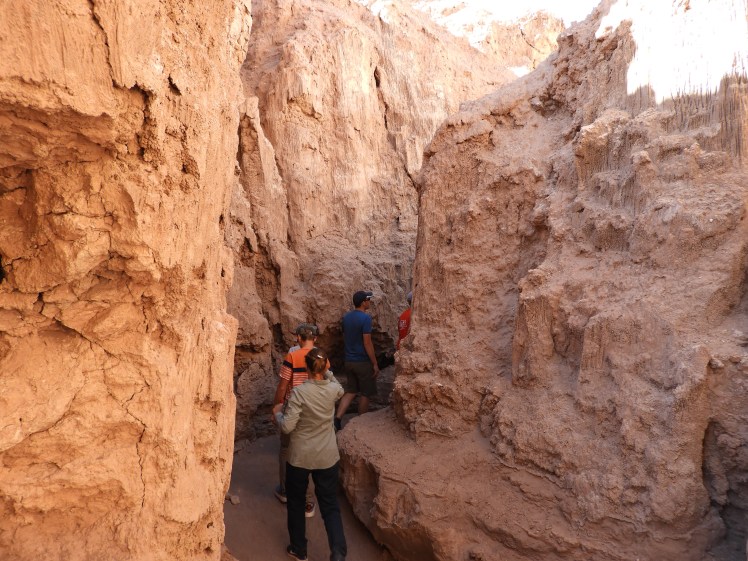 Vid vårt andra stopp fick vi en varning om klaustrofobiskt smala gångar och tog oss sedan mer eller mindre dubbelvikta genom några trånga sprickor i berget. Här hade vatten sköljt bort sediment och putsat saltkristallerna så de såg ut som glas på vissa ställen. Om man delar en ”sten” är det lättare att förstå att marken består av 90 procent salt och att det bara är ett tunt lager sediment ovanpå som gör att allt ändå är brunt.